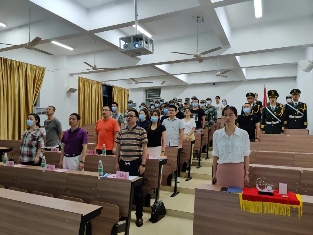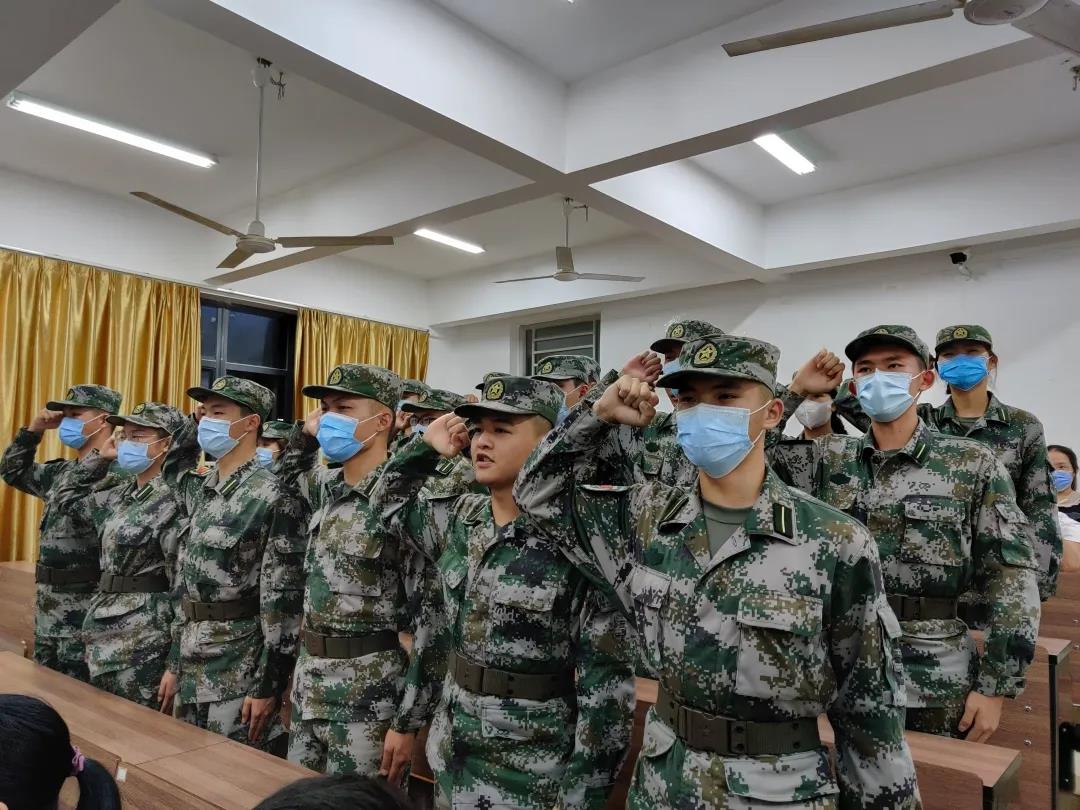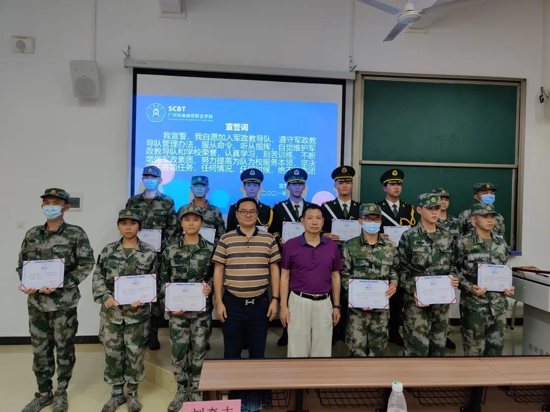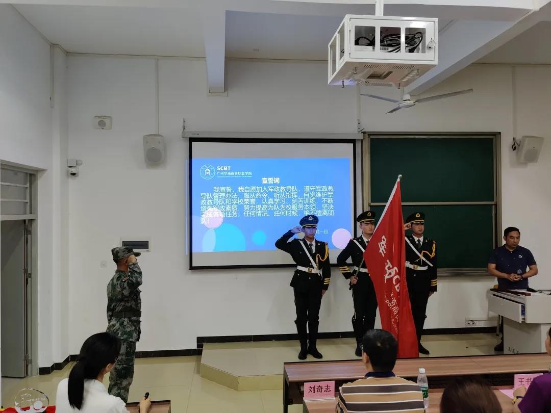 我宣誓,我志愿加入广州华南商贸职业学院军政教导队,服役期间坚决拥护党的领导,服从命令,听从指挥,严守纪律,勤奋好学,自信自强,勇于担当,认真完成每次任务,传承数载钢铁意志,为集体荣誉而努力奋斗!