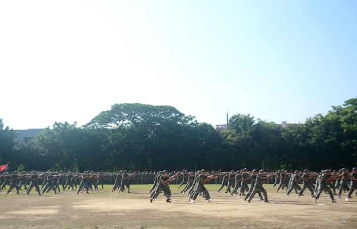 大会由军训基地队长周望龙同志主持。大会在雄壮的国歌和激昂的歌声中拉开了帷幕。2016级新生会操表演正式开始,在教官的带领下各方队依次入场,走向主席台接受检阅。同学们在主席台前认真的展示了检阅式、分列式、刺杀、匕首、擒拿式和配套式等军事动作,新生们用他们整齐划一的动作,斗志昂扬的精神和克服万难的气魄赢得了欢呼喝彩。