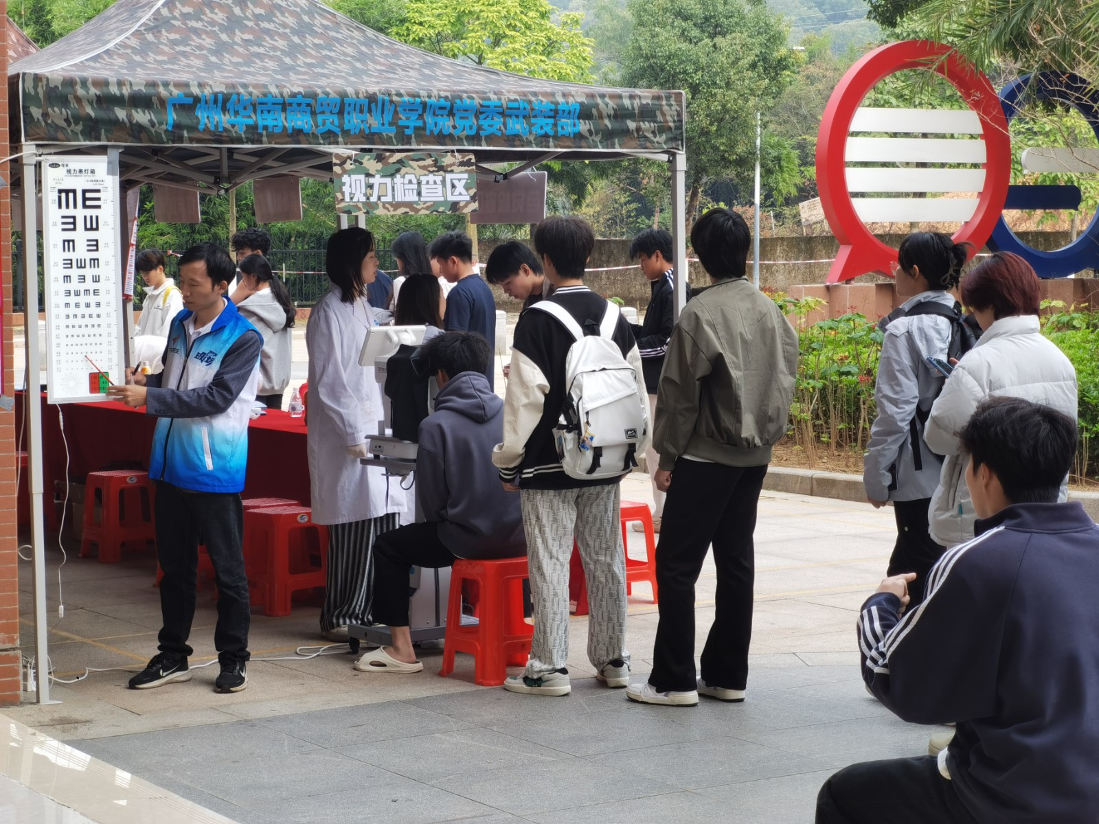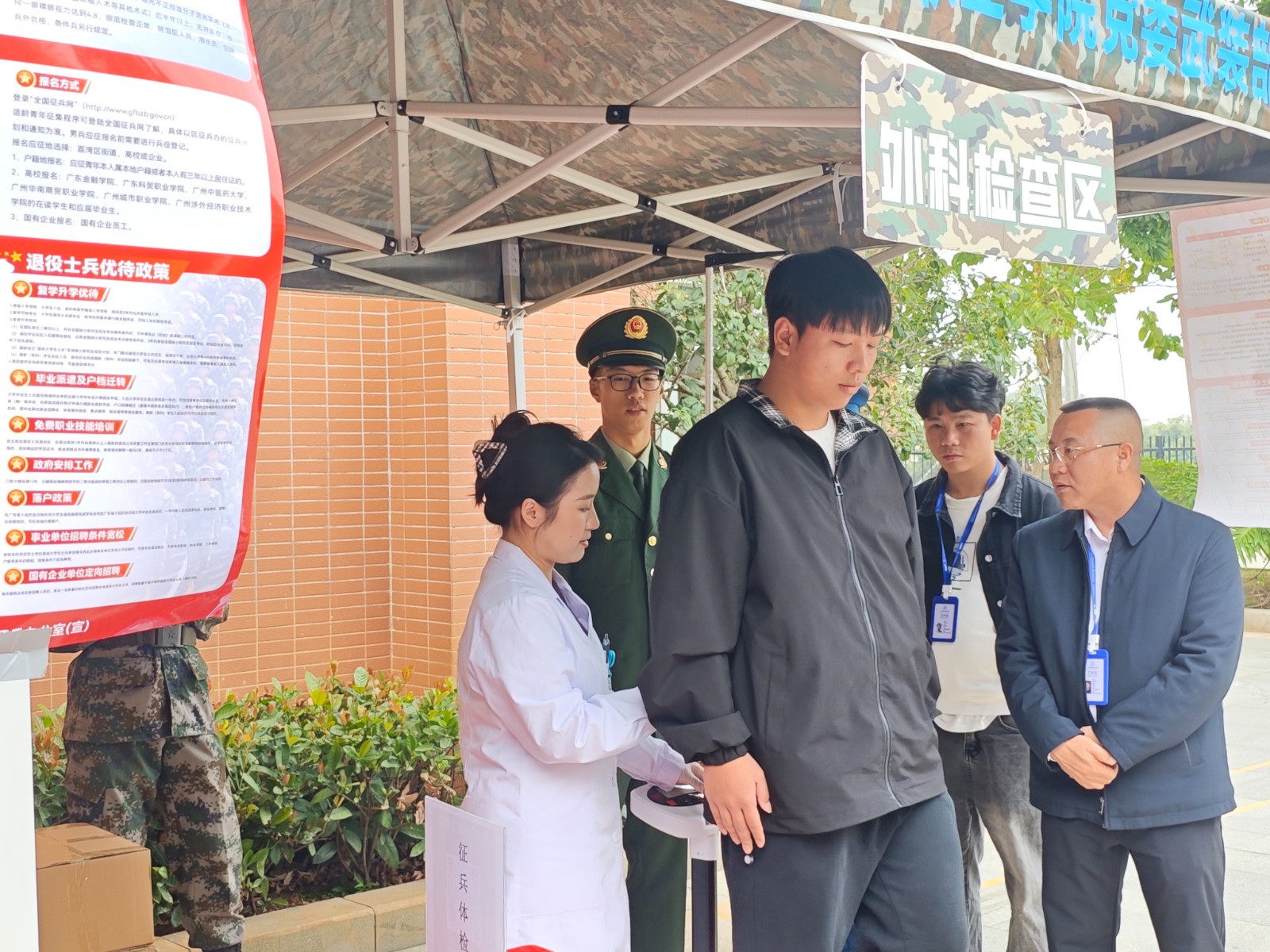 宣讲结束后,同学们有序前往教室外排队参与初筛,现场洋溢着热烈而高涨的氛围。工作人员则以严谨细致的态度,有条不紊地开展色觉检查、身高体重测量及外科检查等各项初筛工作,整个流程规范高效、顺畅有序。等候的间隙,不少同学仍不舍离去,纷纷围在征兵办工作人员身旁,热切追问入伍报名流程、体检标准、军营日常训练等细节问题,字里行间满是投身绿色军营、立志报效祖国的满腔热忱。