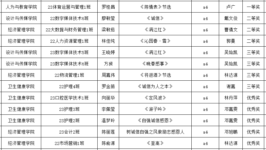 本次硬笔书法获得奖项的共有13名同学,分别是一等奖1名,二等奖3名,三等奖4名,优秀奖5名。以下是获奖同学和指导老师。