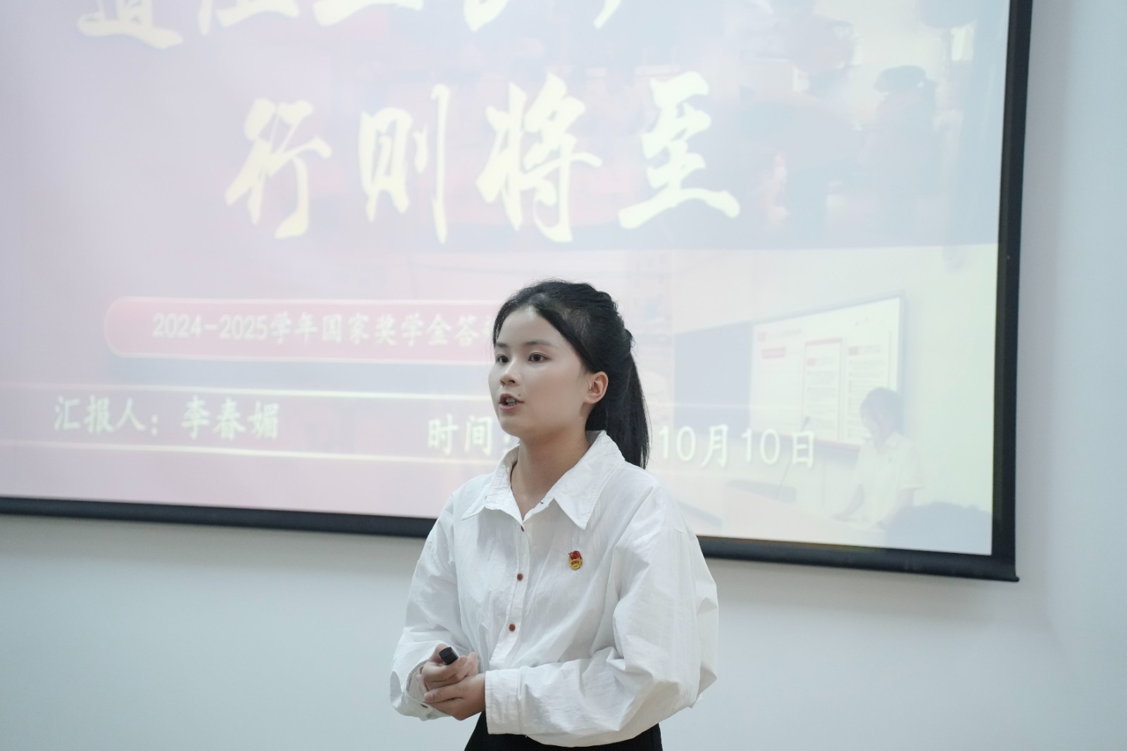 在评审环节中,各二级学院推荐的候选学生依次上台汇报个人情况。他们结合自身学习成绩、社会实践、科研竞赛、志愿服务等方面的表现,展示了新时代华贸学子自强不息、锐意进取的精神风貌。