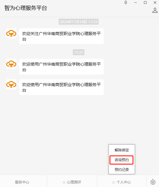 在工作日时段拨打心理中心电话进行预约咨询:020-28388114