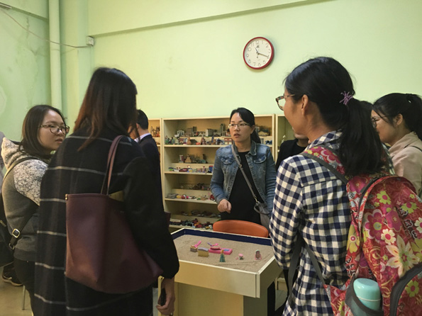 讲座结束之后,在心理健康教育中心黄婷红主任的带领下,参观了广东交通职业技术学院的心理咨询室。进入心理咨询室,大家就有一种温馨的感觉,并去沙盘室、宣泄室、团体辅导室等进行了参观,黄主任还现场为我们老师进行沙盘讲解分析。
