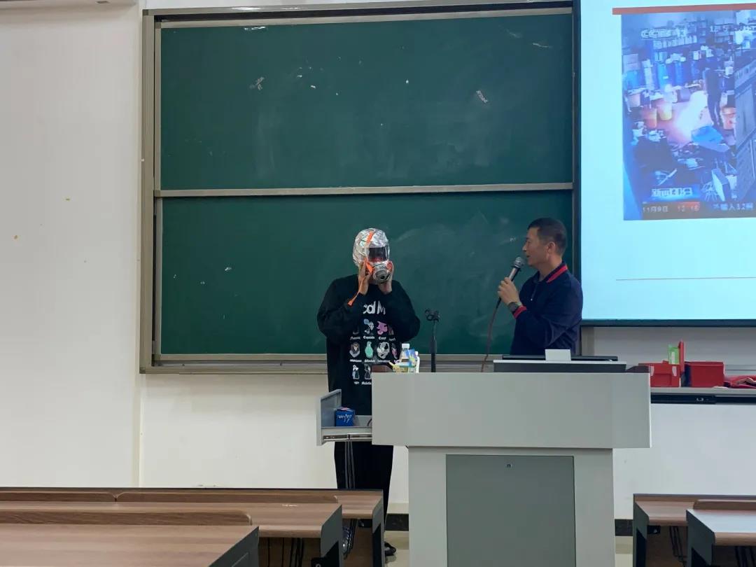 方专员讲述了对于不同原因引起的火灾对应的灭火方法,并亲自示范防毒面具以及灭火器的正确使用方法。