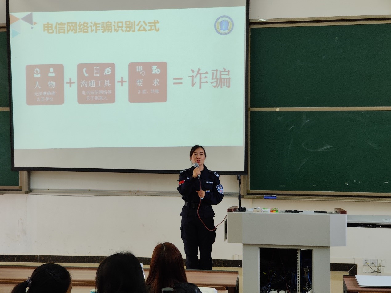 接着,白云区公安分局反诈宣讲队张丽警官向同学们讲述如何预防电信网络诈骗。张警官首先讲述电信网络诈骗定义和当前电信诈骗的形势,指出当前诈骗案件虽然经过警方高压严打逐年下降,但是诈骗团伙仍然存在,诈骗行为屡打不绝,同学们对于预防电信诈骗重点在于“防”,事前防范胜于事后补救。紧接着,张警官向同学们逐一讲解网络购物诈骗、刷单兼职诈骗、冒充客服诈骗、网络贷款诈骗、裸聊、网络交友投资诈骗等一系列诈骗形式和手段,如果同学们发现自己被骗,要马上报警,及时止损。