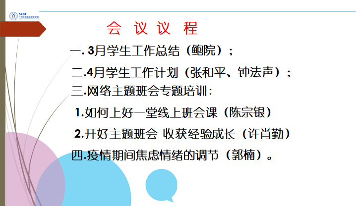 受疫情影响,新学期我们开启“停课不停学”战“疫”云端学堂,为做好疫情防控期间网络主题班会课,本次会议还特别邀请贸易经济系陈宗银老师和财务会计系许肖勤老师做主题班会课培训。陈宗银老师结合自身的经验,介绍了主题班会课所包含的基本要素,分享了她在线上主题班会课的方法、技巧;许肖勤老师从班会前期准备、实施过程、总结反思三个阶段分别介绍了主题班会课的内容。