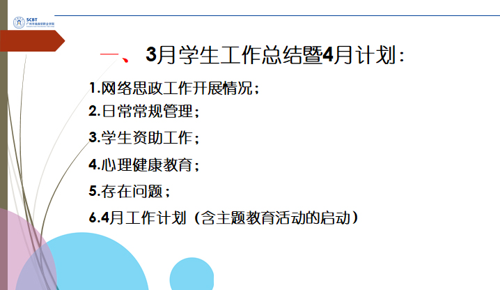张和平处长对学生管理4月份工作计划进行了细致的部署,希望全体学管人员继续做好疫情防控期间的数据上报、网络思政教育、主题教育活动等工作,将“疫情不结束,一刻不松懈,继续做好网络思政教育”贯彻到底。