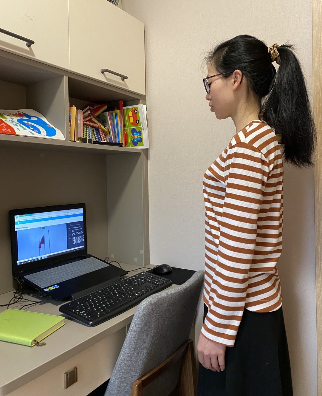 7时55分许,全体师生及家长“云端”相聚,等待升旗仪式开始。三名升旗手昂首挺胸,步伐铿锵,护送国旗来到国旗台下。随着激昂澎湃的国歌声响起,全体人员肃立屏幕前,怀着崇高的敬意,注视着国旗冉冉上升在华贸学院上空。