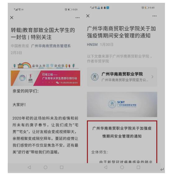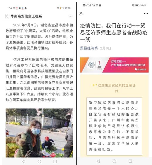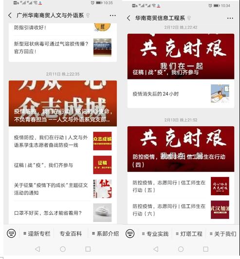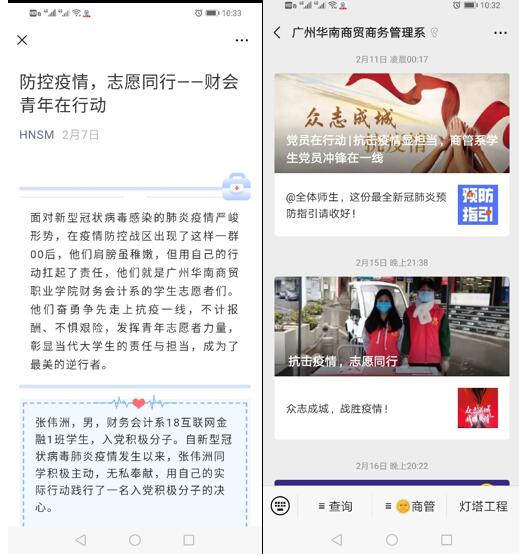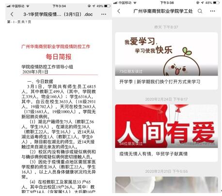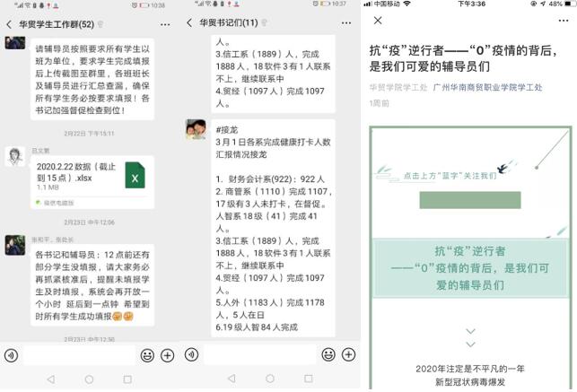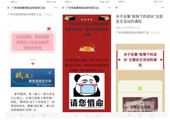 自疫情发生以来,学生处及各系的华贸学工人员通过微信平台积极制作系列疫情防控推文,及时传达上级疫情防控相关通知和疫情防控相关知识。面对新型冠状病毒肺炎疫情防控的严峻形势,全体学工人员首当其冲,争做疫情防控宣传员、信息号和守护者,积极开展网络思想政治教育,确保将通知精神及健康防护知识第一时间传达至每一位学生,引导学生积极面对疫情、科学理性的应对疫情。此外,学生处还组织策划了“疫情下的成长”征文活动,引导学生珍惜生命、直面危机、收获成长。通过学工人员的思想引导,增强了广大学生的抗疫信心;通过学工人员的大力宣传,凝聚了疫情防控正能量。