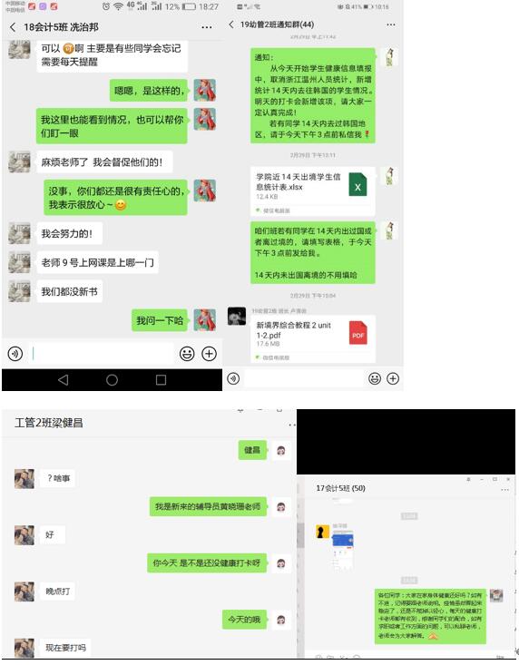 疫情当前,做好全面排查、数据统计是疫情防控各项工作开展的前提和基础,也是战胜疫情防控狙击战的重要保障。为了筑牢数据统计防线,确保防控科学,学生处高度重视,设立疫情信息情报专员,负责疫情期间学生的信息采集和上报。为严抓疫情排查工作,确保学生数据准确、无一人漏报,从2月22日起,学生安全工作实行每日线上健康打卡管理,实行了学生健康动态“日报告”和“零报告”制度,构建了“学院-系-班级”三级防控体系,为全院6316名在校生健康状况建档立卡。由学生处全面统筹,压实系书记、辅导员责任链条,联动各班学生干部,及时掌握学生动向及身体健康状况。由辅导员“一对一”重点关注目前在湖北地区的16名学生,每日填报健康卡,发现问题及时上报。重点摸排“四省十区”及出境学生信息,切实做到排查全覆盖、无盲区、无死角,心中有“数”,切实加强学生安全保障,全力实现学生安全“0”疫情,为疫情有效防控打下了坚实的基础。