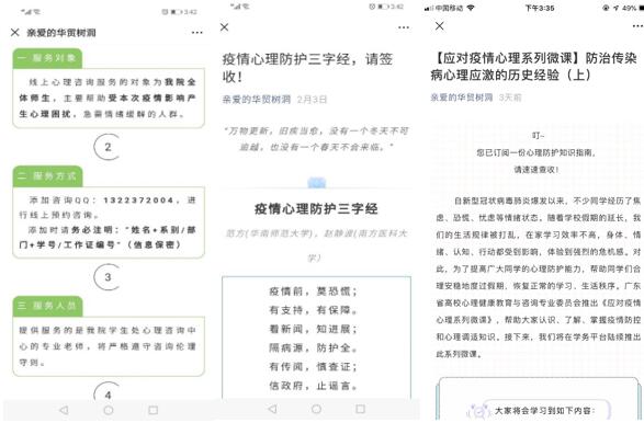 疫情当下,引导师生做好个人心理调适、积极面对疫情尤其重要。心理咨询中心按照上级文件精神,从2月2日开通线上网络心理咨询,为全校师生提供心理援助服务。此外,还通过“亲爱的华贸树洞”心理咨询中心微信公众号推广心理防护、防疫安全公共课等推文,发送防疫心理知识,引导广大师生积极应对疫情。