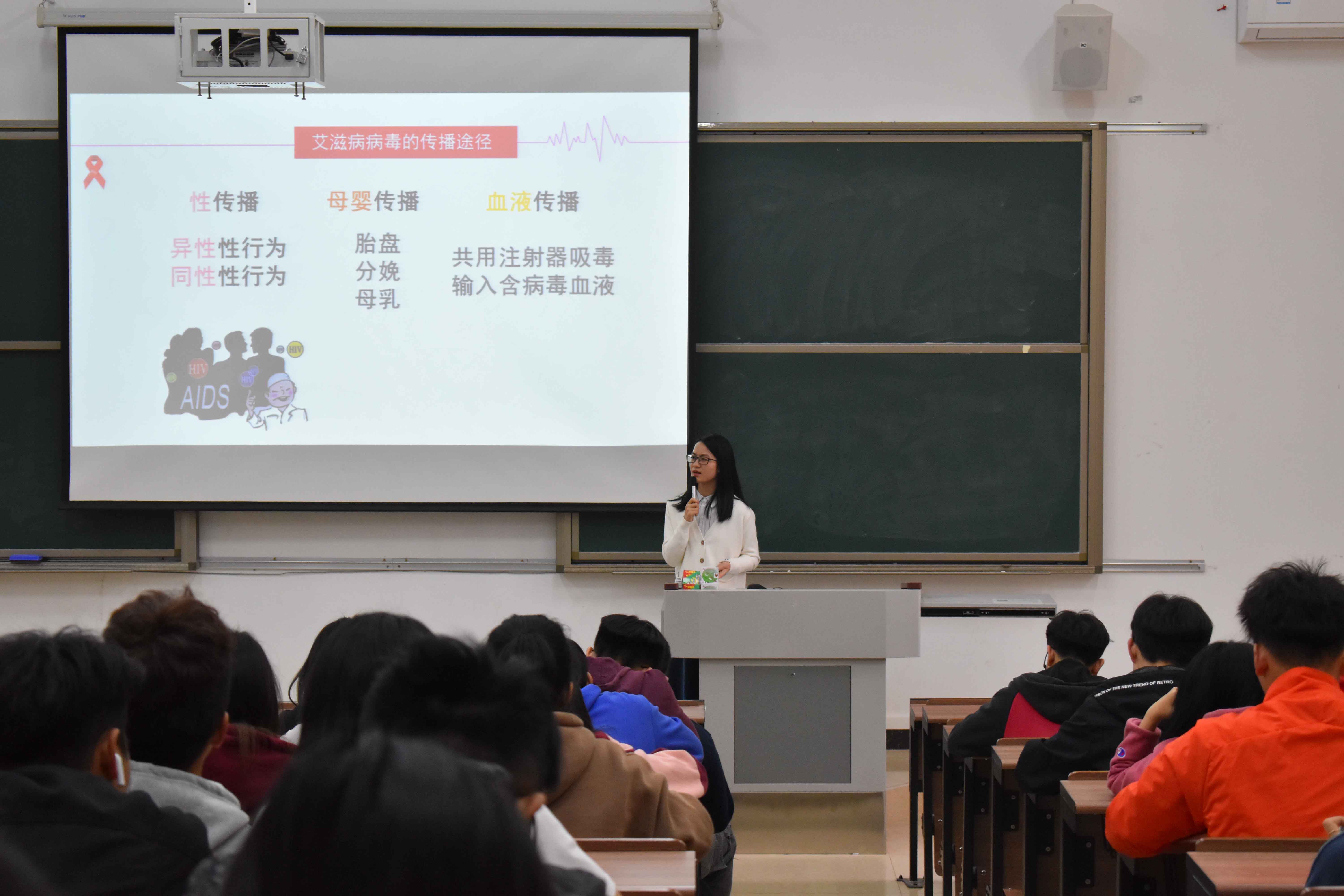 陈老师通过数据展示强调了高校防治艾滋病的重要性和紧迫性,并针对我国艾滋病发展现状艾滋病的致病原理、发病状况、传播途径和艾滋病防治基本知识等方面,结合实际案例,深入浅出展开讲解。生动的事例、准确的数据让同学们对艾滋病有了更加深入的了解。