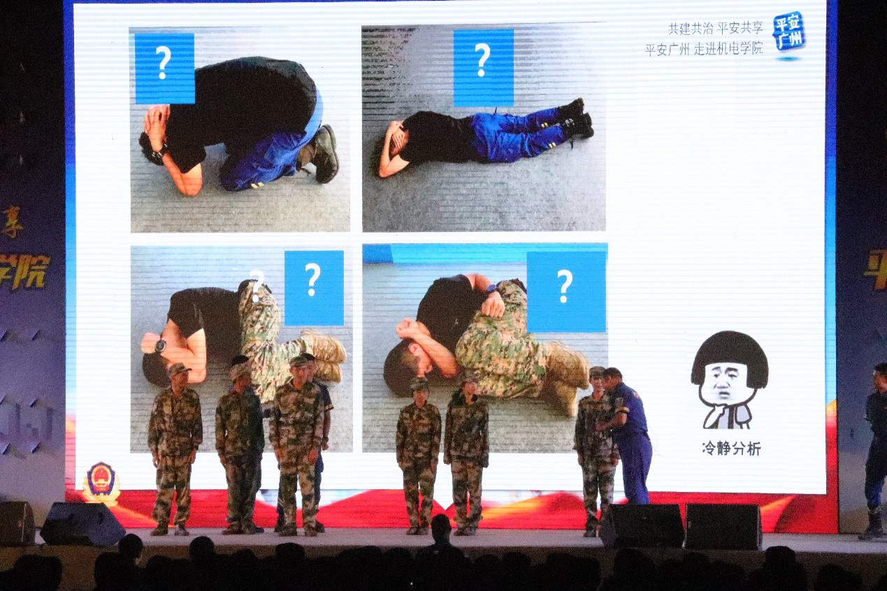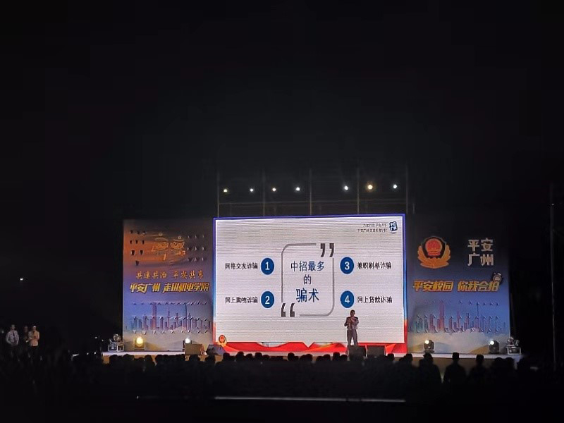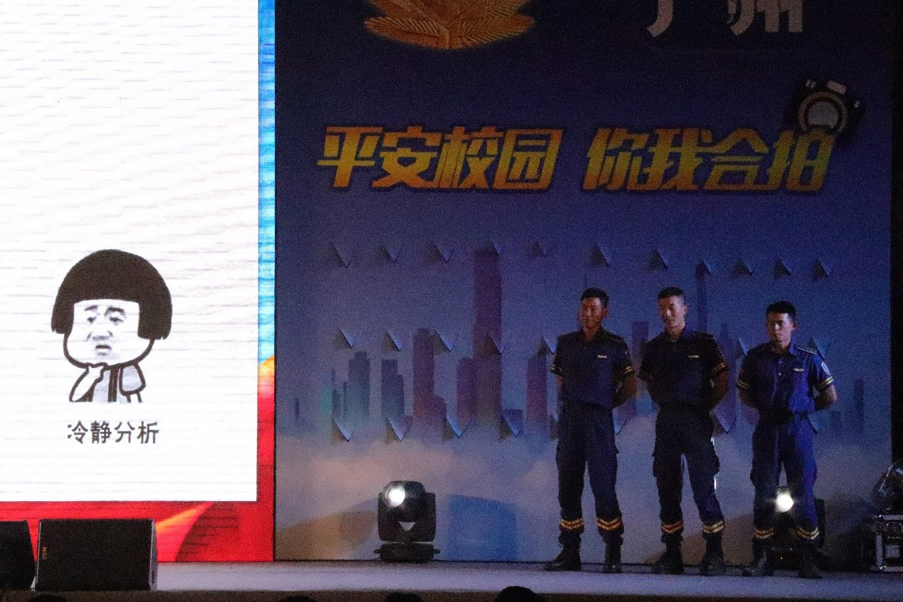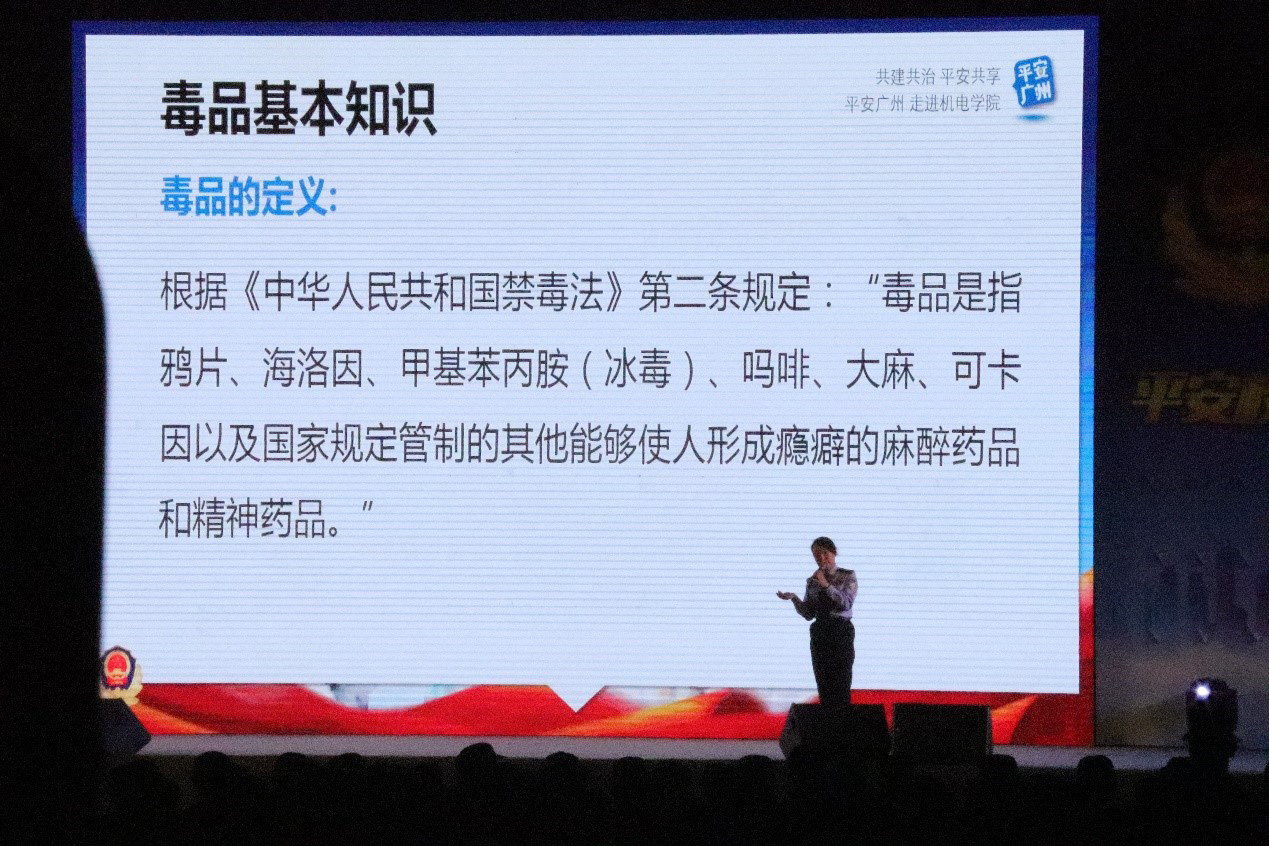 广州市公安局白云分局指挥中心民警薛源、广州市公安局新闻办公室民警张晓萌同志分别对网络购物诈骗、网络贷款诈骗、兼职刷单诈骗和网络交友诈骗等诈骗手段进行解析,围绕多种诈骗手段、结合实际案例,给现场的参会人员带来了一场防网络诈骗安全知识“盛宴”;广州市公安局禁毒工作协调指导处民警郑志进,对常见毒品和防毒禁毒知识进行现场普及宣讲,警示同学们远离毒品,珍爱健康;平安广州志愿服务总队教官黄伟志针对地铁出行拥挤等情况,向与会师生强调了防踩踏、注意安全的重要性,提醒大家注意出行安全。