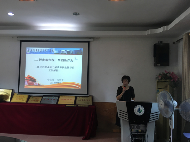 培训会上,首先由学生处处长张和平为全体辅导员作职业能力专题培训,张和平处长从辅导员职业能力解读与新生辅导员工作解析两大方面进行详细讲解,让新入职人员加深了对辅导员工作岗位职责的认识。