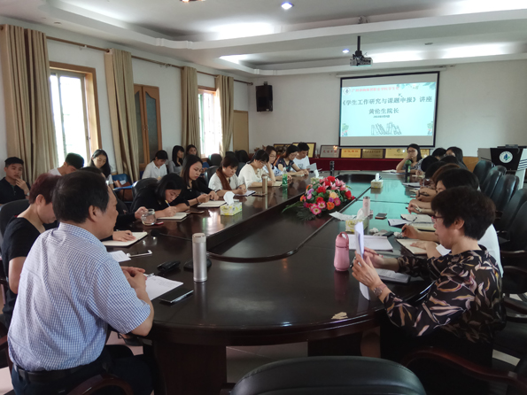 黄伦生院长紧接着作《学生工作研究与课题申报》专题讲座。黄院长从“挖一口深井,筑一个高台”谈起学问与科研的重要性。在确定选题、调查研究、写好学术论文及规范学术语言四个方面进行了系统的培训,大家受益匪浅。