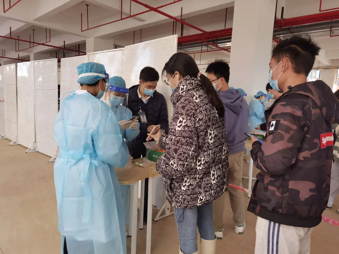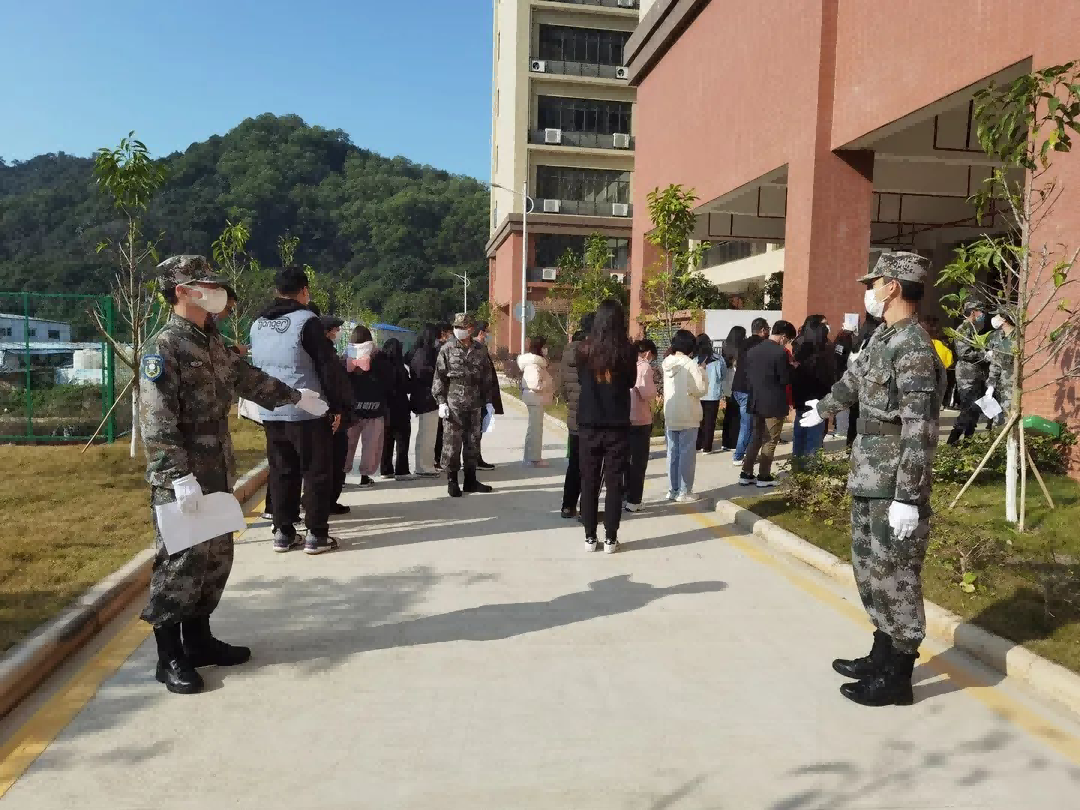 核酸检测前,各二级学院和军政教导队志愿者定岗定人、精心部署,安排专人负责测温、信息采集、现场引导等工作,检测现场秩序井然。