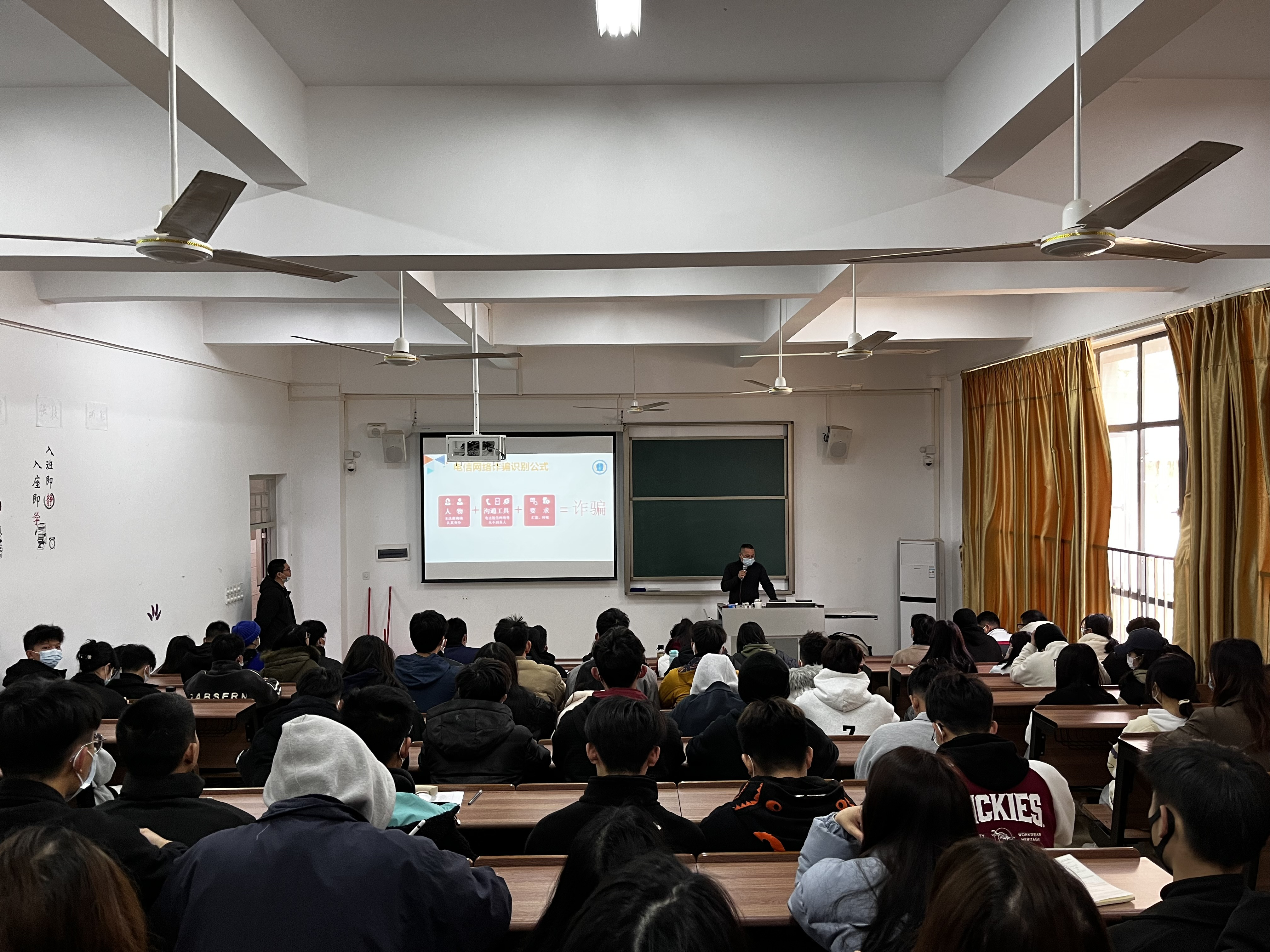 我校武装与安全保卫主管张春生从当前电信网络诈骗形势、“高压严打”措施、常见的诈骗手段、反诈小贴士等方面入手,结合现场互动,形象生动地带来一次电信网络诈骗预防的宣传,为师生敲响反诈防骗警钟。