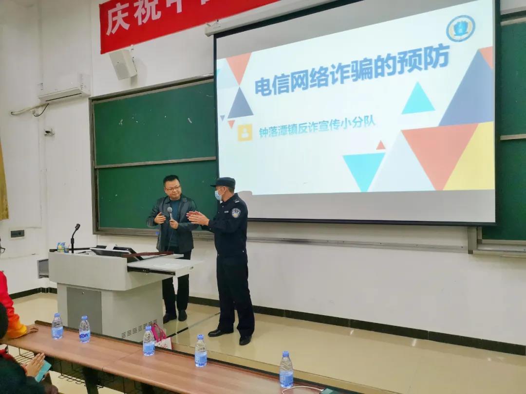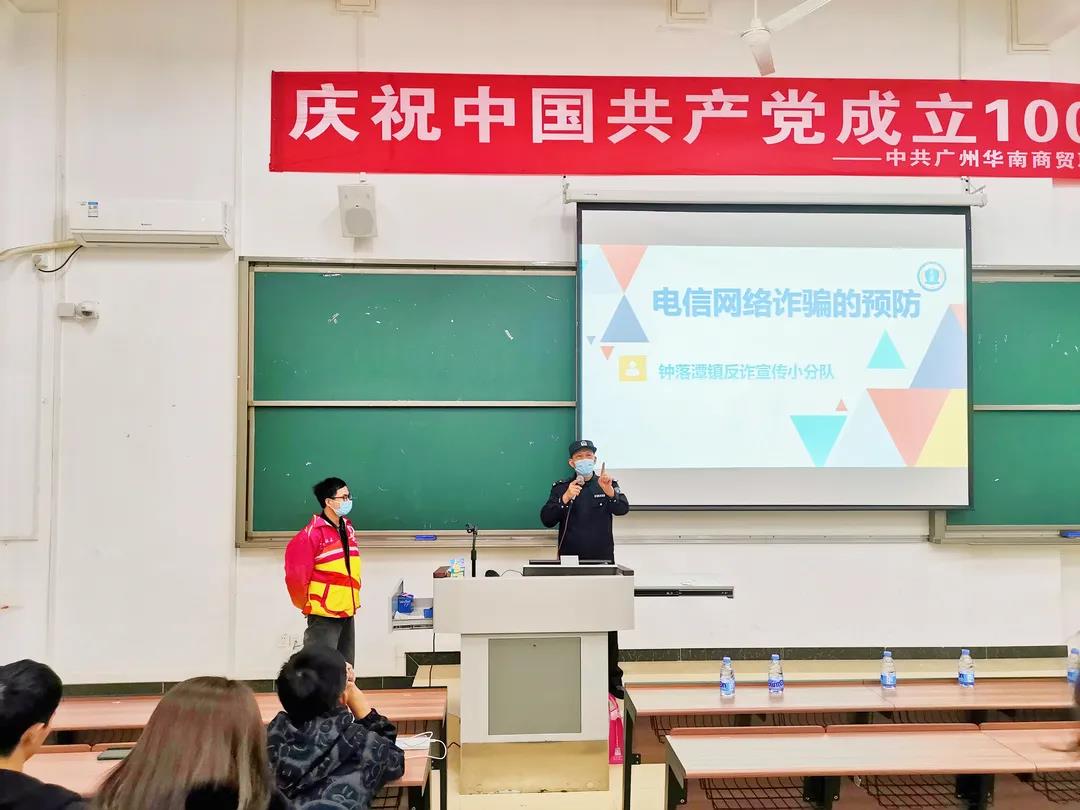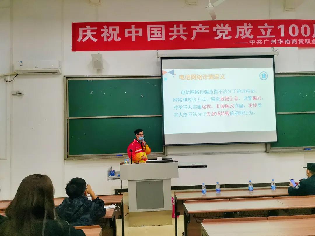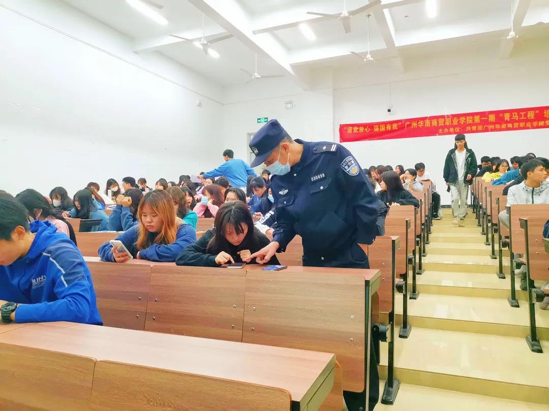 为加深同学们对电信网络诈骗犯罪手法的认知,提高甄别和防范电信网络诈骗的能力,11月8日晚上,白云区钟落潭反诈小组、钟落潭镇派出所社区民警曹汉华警官一行3人来我校,组织160多名学生召开反诈防骗宣讲会。本次会议由学生发展部申海波副部长主持。