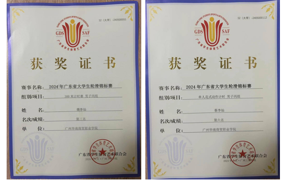 2024年广东省大学生轮滑锦标赛获男子个人速度300米第三名、团体接力第四名、团体拉龙第五名、个人花式绕桩第六名、个人速度过桩第六名以及团体积分第八名