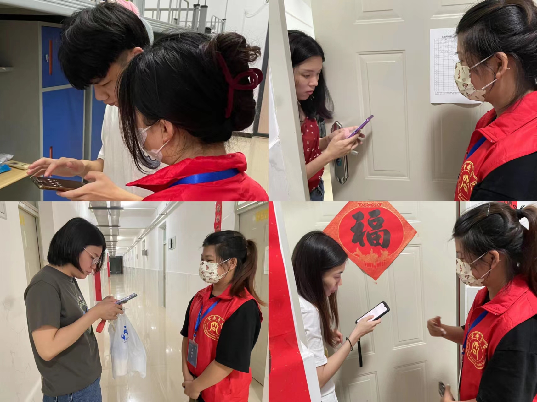 6月8日,反诈志愿者服务队利用晚上时间,通过扫楼洗楼的方式,对教工宿舍所有老师的“反诈小程序”和“平安白云”注册、登记进行检查及使用指导。同时,志愿者们后续仍然会采用扫楼的方式对师生们进行检查,希望大家对于他们的工作予以理解和配合!